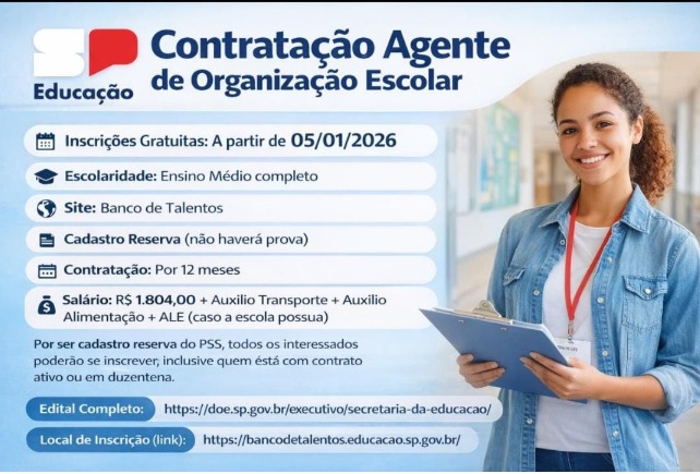 A inscrição no Banco de Talentos tem como objetivo registrar o interesse do candidato em atuar no posto de trabalho de Agente de Organização Escolar (AOE), garantindo ao candidato inscrito a possibilidade de convocação para os Processos Seletivos Simplificados (PSS) das unidades escolares da rede estadual paulista.